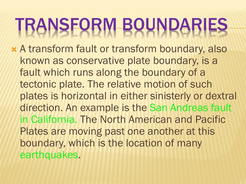 A transform fault or transform boundary, also known as conservative plate boundary, is a fault which runs along the boundary of a tectonic plate. The relative motion of such plates is horizontal in either sinisterly or dextral direction. An example is the San Andreas fault in California. The North American and Pacific Plates are moving past one another at this boundary, which is the location of many earthquakes. Transform boundaries