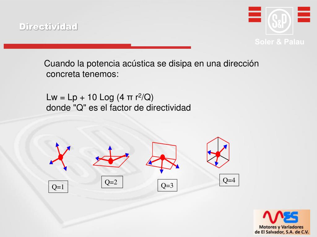Q=4 Q=2 Q=3 Q=1 Directividad Cuando la potencia acústica se disipa en una dirección concreta tenemos: Lw = Lp + 10 Log (4 πr2/Q) donde "Q" es el factor de directividad
