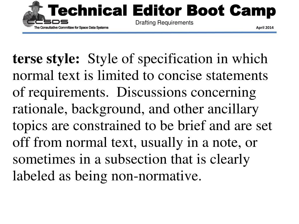 Drafting Requirements Terse Style Drafting a document in Terse Style is relatively easy. Rewriting a document that does not conform to Terse Style is extremely time consuming. If the rewrite is done by someone, like the CCSDS Document Editor, who was not involved in definition of requirements in the Working Group, a great deal of guesswork may be involved in determining which elements should be normative and which should not. That is to say, if the working group does not set out from the start to write normative-track documents in terse style, the working group should not expect to meet its schedule.