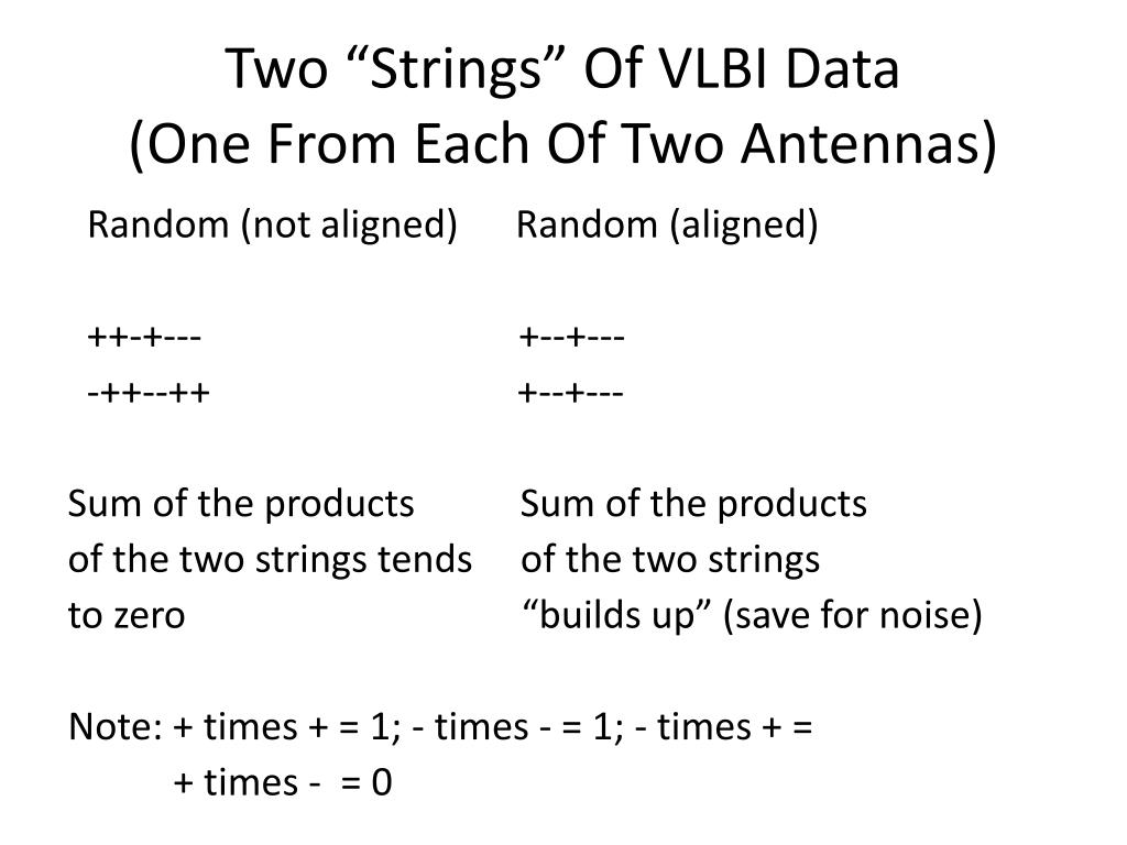 Two “Strings” Of VLBI Data (One From Each Of Two Antennas) Random (not aligned) Random (aligned) ++-+--- +--+--- -++--++ +--+--- Sum of the products Sum of the products of the two strings tends of the two strings to zero “builds up” (save for noise) Note: + times + = 1; - times - = 1; - times + = + times - = 0