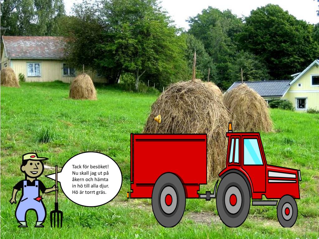 Tack för besöket! Nu skall jag ut på åkern och hämta in hö till alla djur. Hö är torrt gräs.