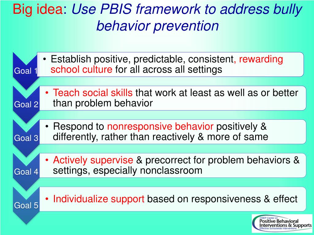 Integrated Elements Supporting Social Competence & Academic Achievement OUTCOMES Supporting Decision Making Supporting Staff Behavior DATA SYSTEMS “BULLY BEHAVIOR” PRACTICES Supporting Student Behavior