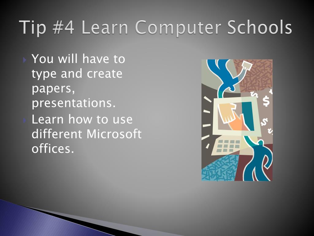 Tip #4 Learn Computer Schools • You will have to type and create papers, presentations. • Learn how to use different Microsoft offices.