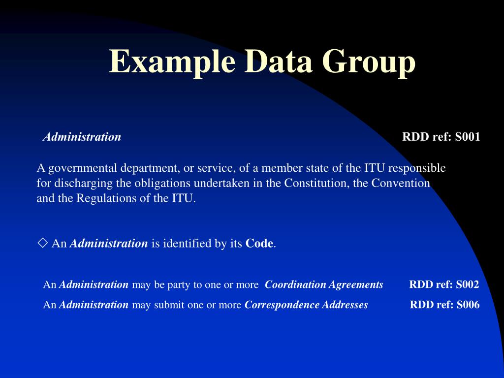 Example Data Group Administration RDD ref: S001 A governmental department, or service, of a member state of the ITU responsiblefor discharging the obligations undertaken in the Constitution, the Conventionand the Regulations of the ITU. An Administration is identified by its Code. An Administration may be party to one or more Coordination Agreements RDD ref: S002 An Administration may submit one or more Correspondence AddressesRDD ref: S006