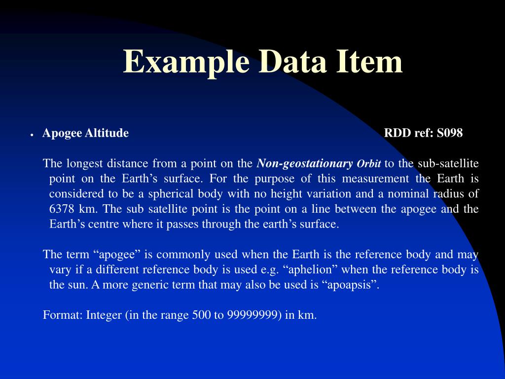 Example Data Item ·Apogee Altitude RDD ref: S098 The longest distance from a point on the Non-geostationary Orbitto the sub-satellite point on the Earth’s surface. For the purpose of this measurement the Earth is considered to be a spherical body with no height variation and a nominal radius of 6378 km. The sub satellite point is the point on a line between the apogee and the Earth’s centre where it passes through the earth’s surface. The term “apogee” is commonly used when the Earth is the reference body and may vary if a different reference body is used e.g. “aphelion” when the reference body is the sun. A more generic term that may also be used is “apoapsis”. Format: Integer (in the range 500 to 99999999) in km.