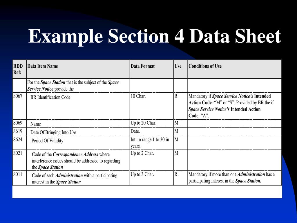 RDD Contents • Section 1:Introduction • Section 2:Terrestrial Notification Data • Section 3:Description of Terrestrial Data Items • Section 4:Space Advance Publication, Notification and Coordination Data • Section 5:Description of Space Data Items • Section 6:Data Item Formats • Section 7:Diagrams • Section 8:Cross-Reference Tables between RR Appendix S4 and RDD • Section 9:Appendices • Section 10:Data Item Reference Index