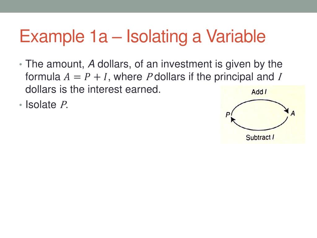 Example 1a – Isolating a Variable • The amount, A dollars, of an investment is given by the formula , where P dollars if the principal and I dollars is the interest earned. • Isolate P.