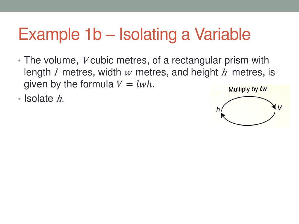 Example 1b – Isolating a Variable • The volume, Vcubic metres, of a rectangular prism with length lmetres, width w metres, and height hmetres, is given by the formula • Isolate h.