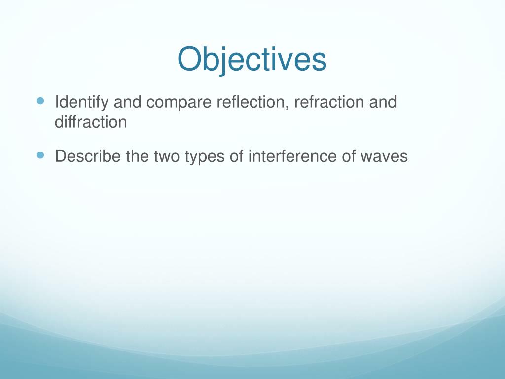 Objectives • Identify and compare reflection, refraction and diffraction • Describe the two types of interference of waves
