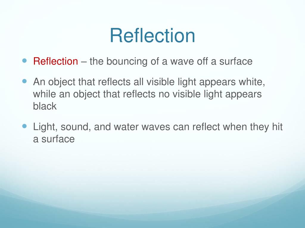 Reflection • Reflection – the bouncing of a wave off a surface • An object that reflects all visible light appears white, while an object that reflects no visible light appears black • Light, sound, and water waves can reflect when they hit a surface