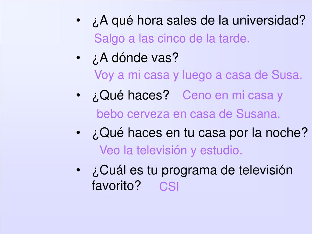 Salgo a las cinco de la tarde. • ¿A qué hora sales de la universidad? • ¿A dónde vas? • ¿Qué haces? • ¿Qué haces en tu casa por la noche? • ¿Cuál es tu programa de televisión favorito? Voy a mi casa y luego a casa de Susa. Ceno en mi casa y bebo cerveza en casa de Susana. Veo la televisión y estudio. CSI