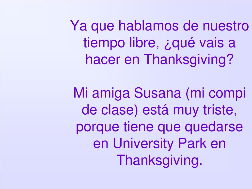 Ya que hablamos de nuestro tiempo libre, ¿qué vais a hacer en Thanksgiving? Mi amiga Susana (mi compi de clase) está muy triste, porque tiene que quedarse en University Park en Thanksgiving.