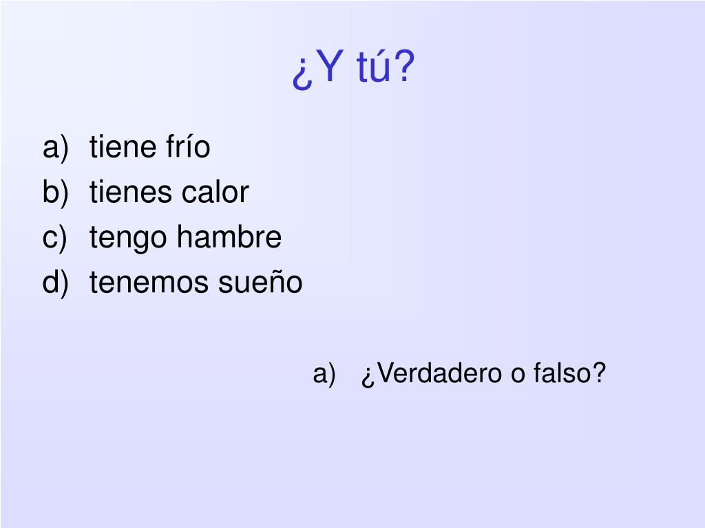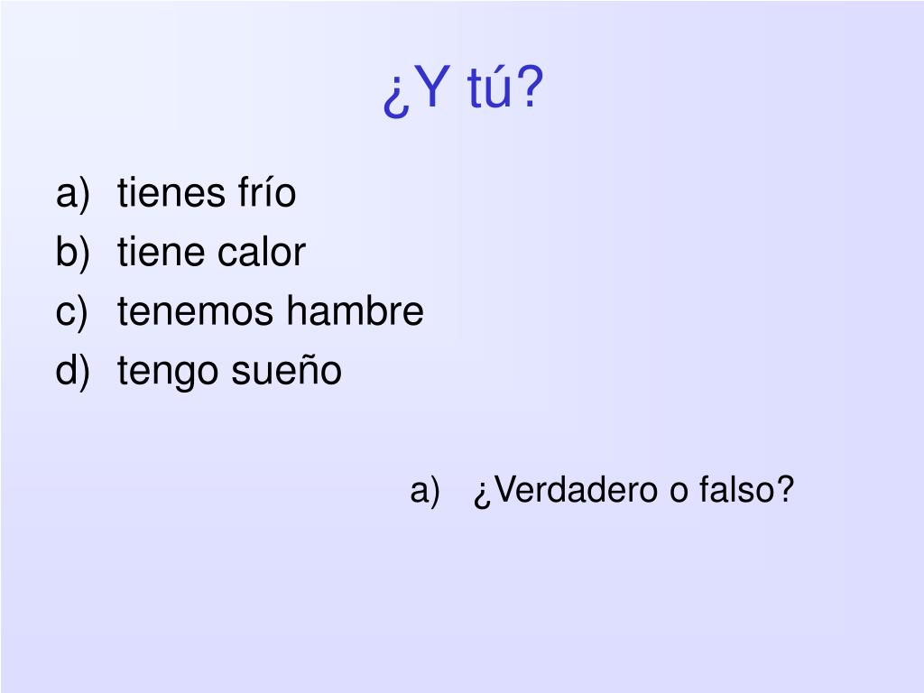 ¿Y tú? • tienes frío • tiene calor • tenemos hambre • tengo sueño • ¿Verdadero o falso?