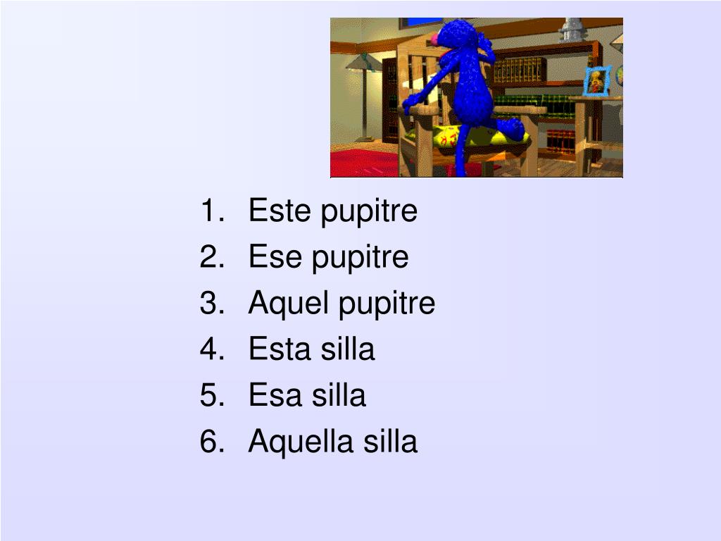 Este pupitre • Ese pupitre • Aquel pupitre • Esta silla • Esa silla • Aquella silla