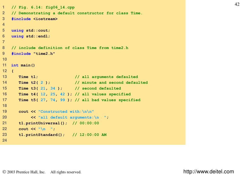 1 // Fig. 6.14: fig06_14.cpp 2 // Demonstrating a default constructor for class Time. 3 #include <iostream> 4 5 using std::cout; 6 using std::endl; 7 8 // include definition of class Time from time2.h 9 #include "time2.h" 10 11 int main() 12 { 13 Time t1; // all arguments defaulted 14 Time t2( 2 ); // minute and second defaulted 15 Time t3( 21, 34 ); // second defaulted 16 Time t4( 12, 25, 42 ); // all values specified 17 Time t5( 27, 74, 99 ); // all bad values specified 18 19 cout << "Constructed with:\n\n" 20 << "all default arguments:\n "; 21 t1.printUniversal(); // 00:00:00 22 cout << "\n "; 23 t1.printStandard(); // 12:00:00 AM 24