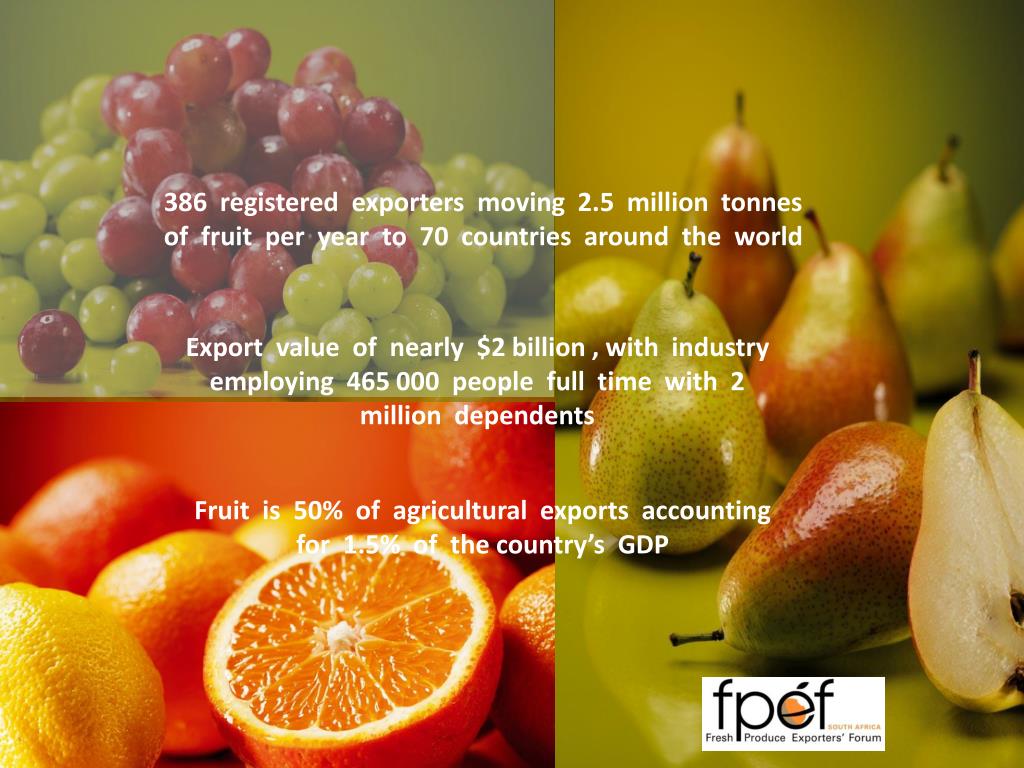 386 registered exporters moving 2.5 million tonnes of fruit per year to 70 countries around the world Export value of nearly $2 billion , with industry employing 465 000 people full time with 2 million dependents Fruit is 50% of agricultural exports accounting for 1.5% of the country’s GDP