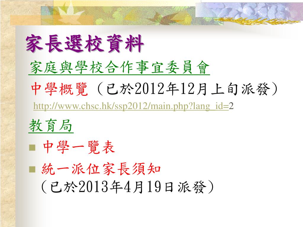 家長選校資料 家庭與學校合作事宜委員會 中學概覽 (已於2012年12月上旬派發) http://www.chsc.hk/ssp2012/main.php?lang_id=2 教育局 • 中學一覽表 • 統一派位家長須知(已於2013年4月19日派發)