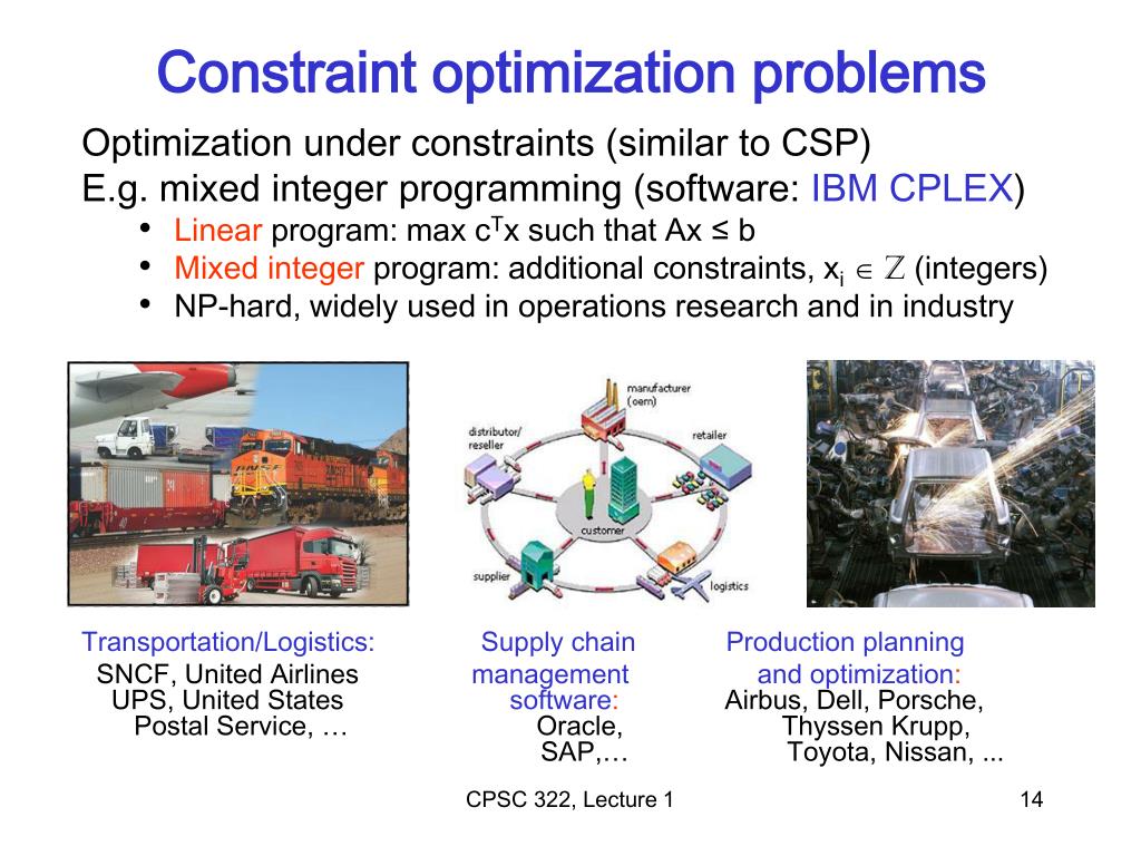 Constraint optimization problems • Optimization under constraints (similar to CSP) • E.g. mixed integer programming (software: IBM CPLEX) • Linear program: max cTx such that Ax ≤ b • Mixed integer program: additional constraints, xi Z (integers) • NP-hard, widely used in operations research and in industry Transportation/Logistics: Supply chain Production planning SNCF, United Airlines management and optimization: UPS, United States software: Airbus, Dell, Porsche, Postal Service, … Oracle, ThyssenKrupp, SAP,… Toyota, Nissan, ... CPSC 322, Lecture 1
