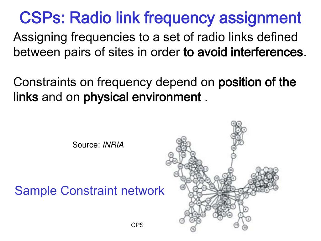 CSPs: Radio link frequency assignment Assigning frequencies to a set of radio links defined between pairs of sites in order to avoid interferences. Constraints on frequency depend on position of the links and on physical environment . Source: INRIA Sample Constraint network CPSC 322, Lecture 3