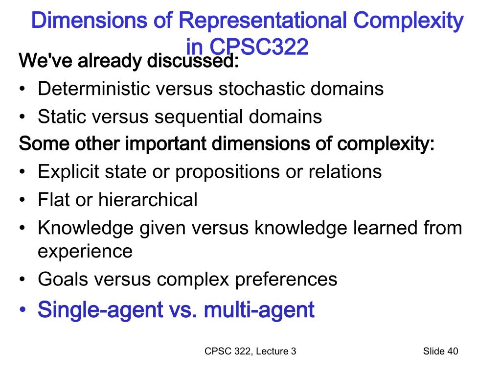 Dimensions of Representational Complexityin CPSC322 • We've already discussed: • Deterministic versus stochastic domains • Static versus sequential domains • Some other important dimensions of complexity: • Explicit state or propositions or relations • Flat or hierarchical • Knowledge given versus knowledge learned from experience • Goals versus complex preferences • Single-agent vs. multi-agent CPSC 322, Lecture 3