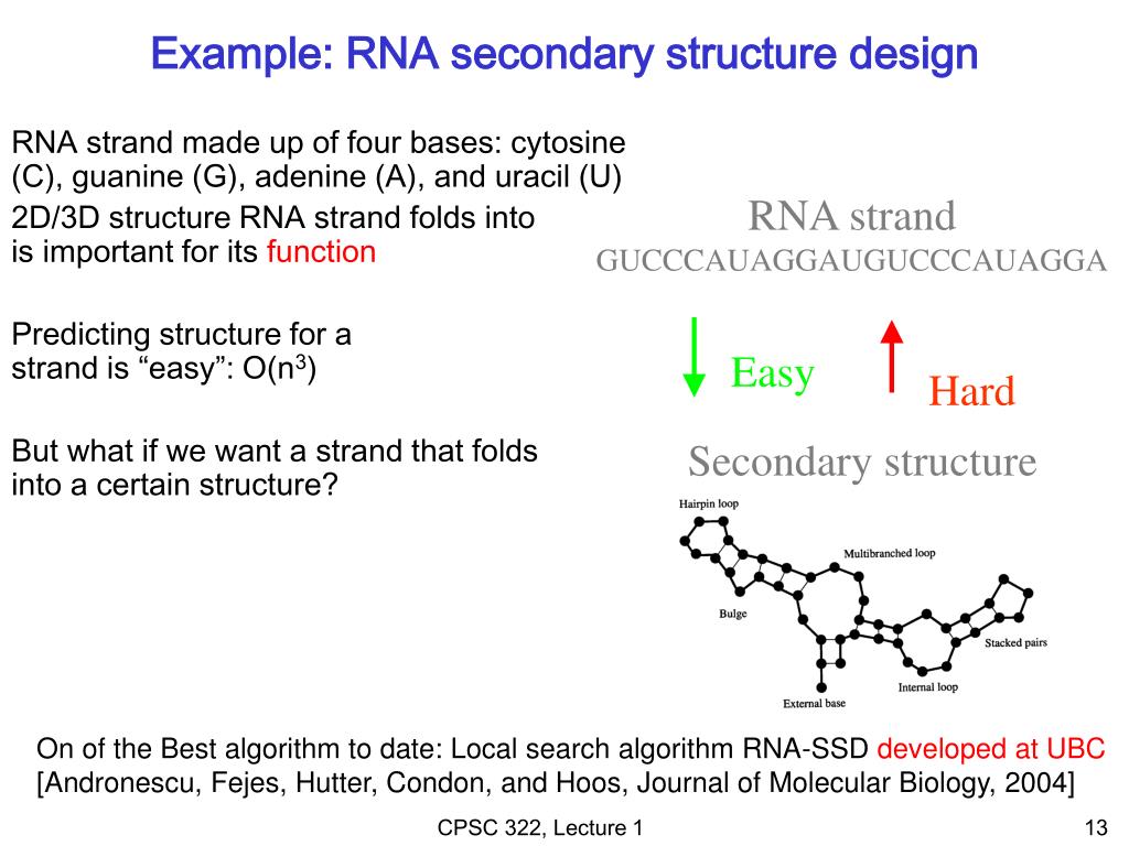 Example: RNA secondary structure design • RNA strand made up of four bases: cytosine (C), guanine (G), adenine (A), and uracil (U) • 2D/3D structure RNA strand folds into is important for its function • Predicting structure for a strand is “easy”: O(n3) • But what if we want a strand that folds into a certain structure? RNA strandGUCCCAUAGGAUGUCCCAUAGGA Easy Hard Secondary structure • On of the Best algorithm to date: Local search algorithm RNA-SSD developed at UBC[Andronescu, Fejes, Hutter, Condon, and Hoos, Journal of Molecular Biology, 2004] CPSC 322, Lecture 1