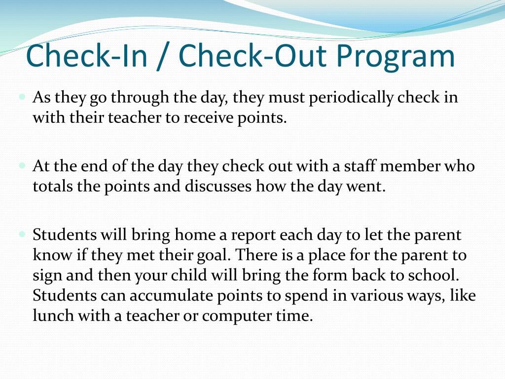Check-In / Check-Out Program • As they go through the day, they must periodically check in with their teacher to receive points. • At the end of the day they check out with a staff member who totals the points and discusses how the day went. • Students will bring home a report each day to let the parent know if they met their goal. There is a place for the parent to sign and then your child will bring the form back to school. Students can accumulate points to spend in various ways, like lunch with a teacher or computer time.