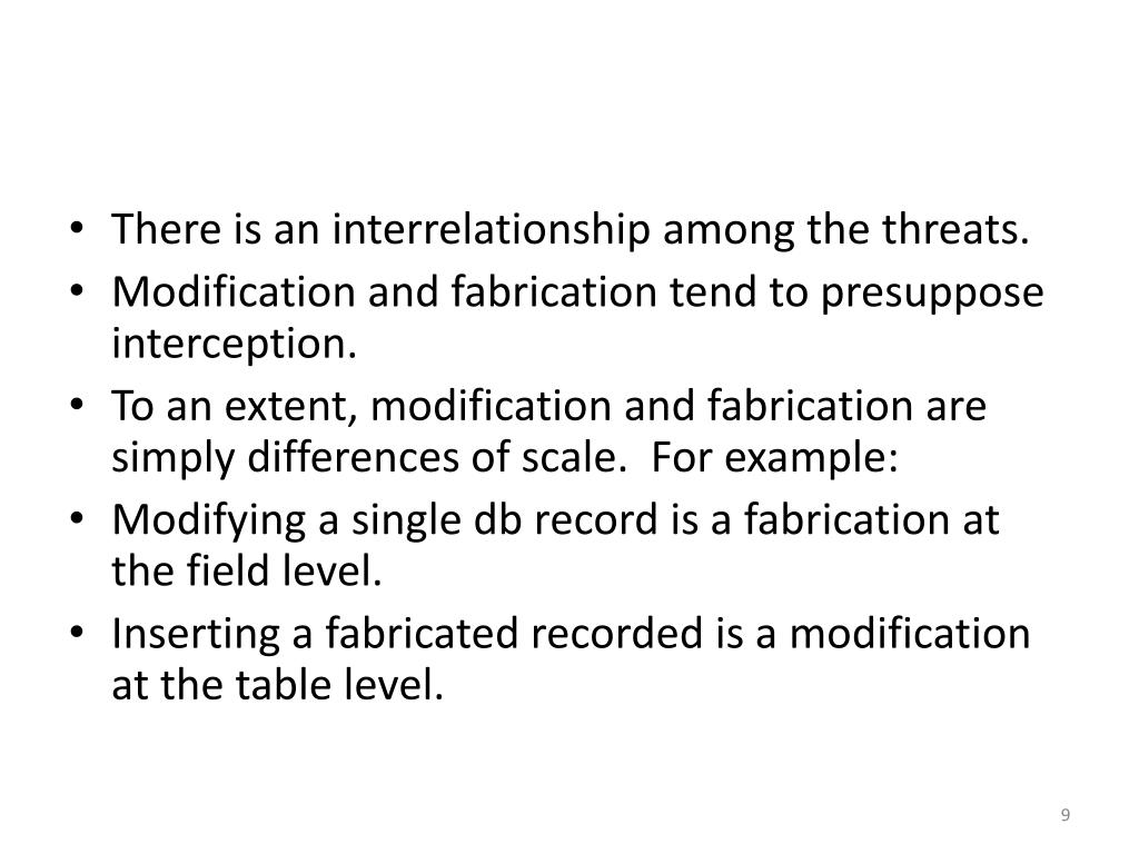 There is an interrelationship among the threats. • Modification and fabrication tend to presuppose interception. • To an extent, modification and fabrication are simply differences of scale. For example: • Modifying a single db record is a fabrication at the field level. • Inserting a fabricated recorded is a modification at the table level.