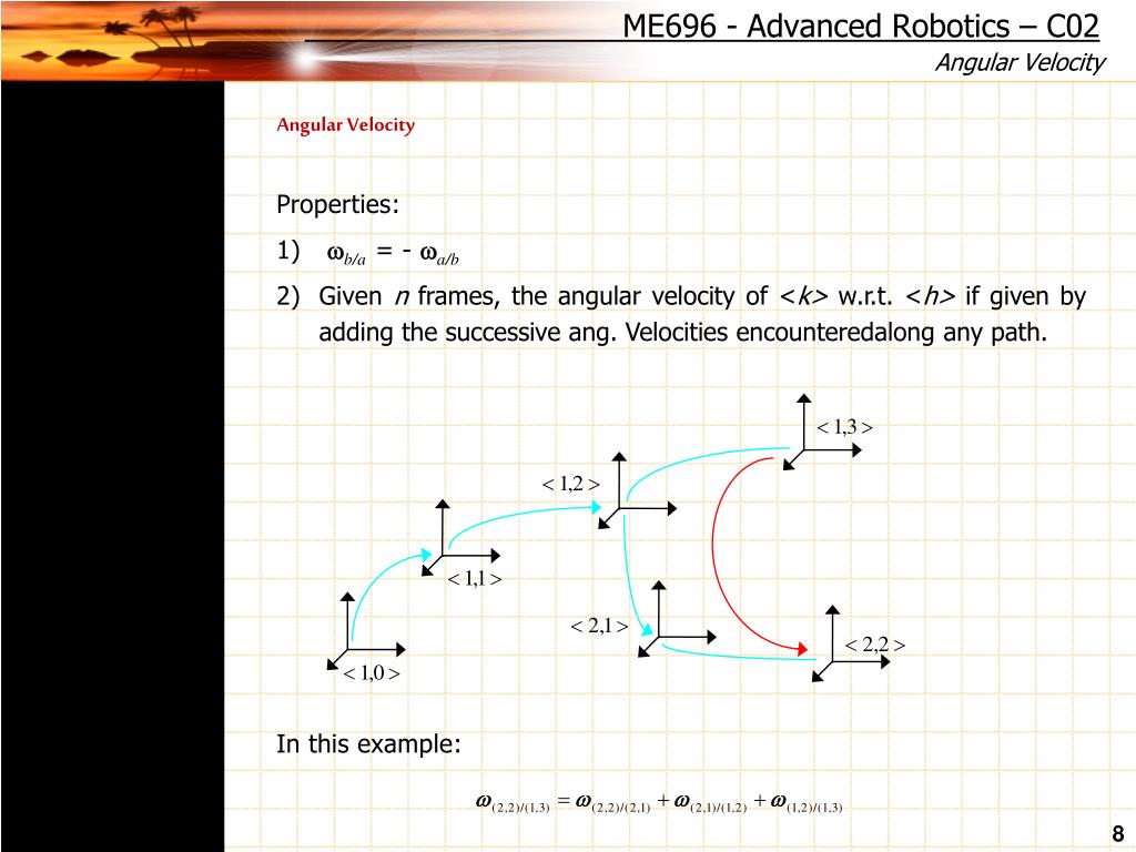 ME696 - Advanced Robotics – C02 • Angular Velocity • Properties: • b/a = - a/b • Given n frames, the angular velocity of <k> w.r.t. <h> if given by adding the successive ang. Velocities encounteredalong any path. • In this example: Angular Velocity 8