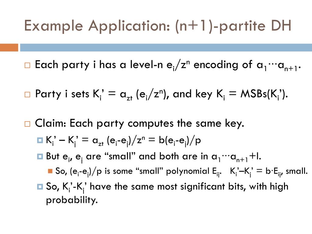 Example Application: (n+1)-partite DH • Each party i has a level-n ei/zn encoding of a1∙∙∙an+1. • Party i sets Ki’ = azt (ei/zn), and key Ki = MSBs(Ki’). • Claim: Each party computes the same key. • Ki’ – Kj’ = azt (ei-ej)/zn = b(ei-ej)/p • But ei, ej are “small” and both are in a1∙∙∙an+1+I. • So, (ei-ej)/p is some “small” polynomial Eij. Ki’–Kj’ = b∙Eij, small. • So, Ki’-Kj’ have the same most significant bits, with high probability.