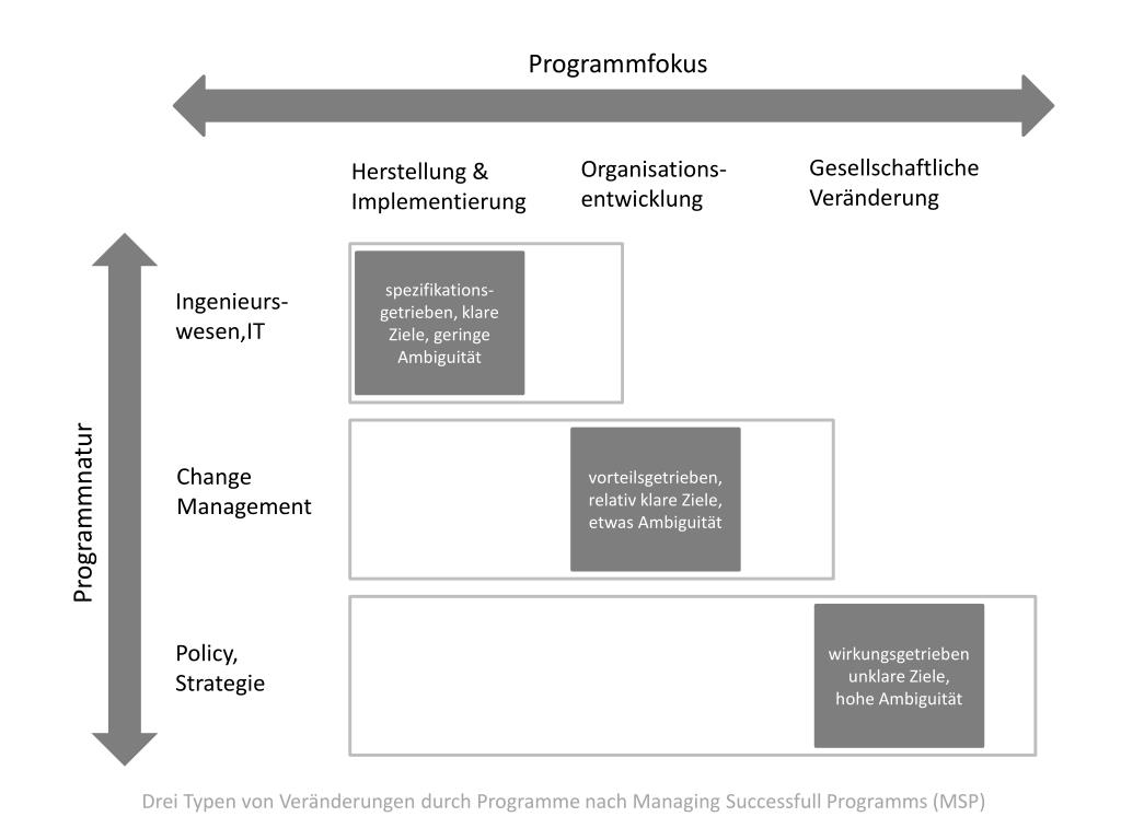 Programmfokus Gesellschaftliche Veränderung Organisations- entwicklung Herstellung & Implementierung spezifikations-getrieben, klare Ziele, geringe Ambiguität Ingenieurs- wesen,IT vorteilsgetrieben, relativ klare Ziele, etwas Ambiguität Change Management Programmnatur wirkungsgetriebenunklare Ziele, hohe Ambiguität Policy, Strategie Drei Typen von Veränderungen durch Programme nach Managing Successfull Programms (MSP)