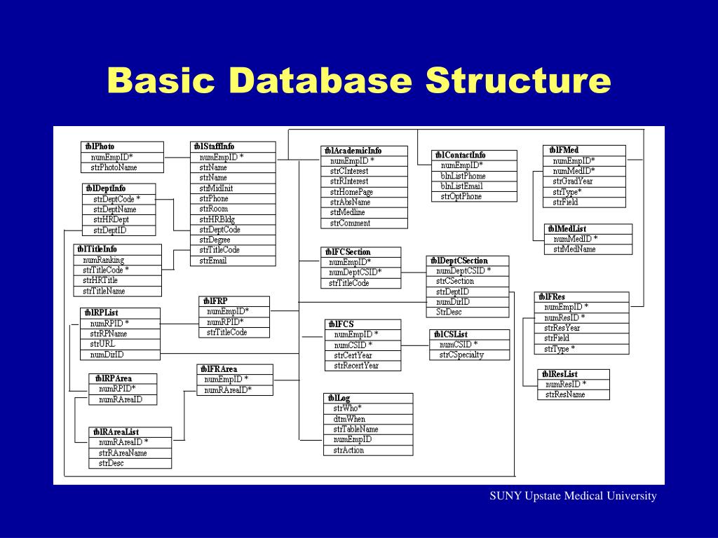 Faculty Database Overview • Three Views for Internet Audiences • Department: indexed by title, research area, or clinical section • Research: for graduate students or researchers in other institutions • Clinical: for patients • PowerPoint Demo • http://www.upstate.edu/webDB/demo/