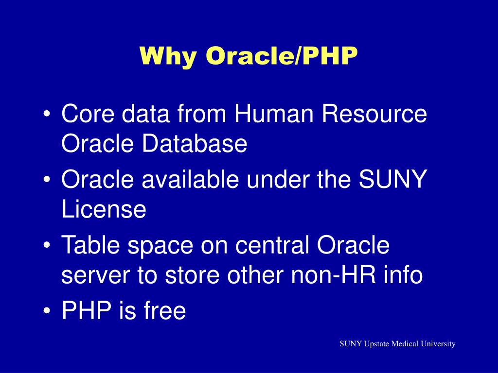 Why Oracle/PHP • Core data from Human Resource Oracle Database • Oracle available under the SUNY License • Table space on central Oracle server to store other non-HR info • PHP is free