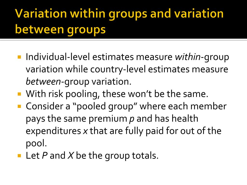 Variation within groups and variation between groups • Individual-level estimates measure within-group variation while country-level estimates measure between-group variation. • With risk pooling, these won’t be the same. • Consider a “pooled group” where each member pays the same premium p and has health expenditures x that are fully paid for out of the pool. • Let P and X be the group totals.