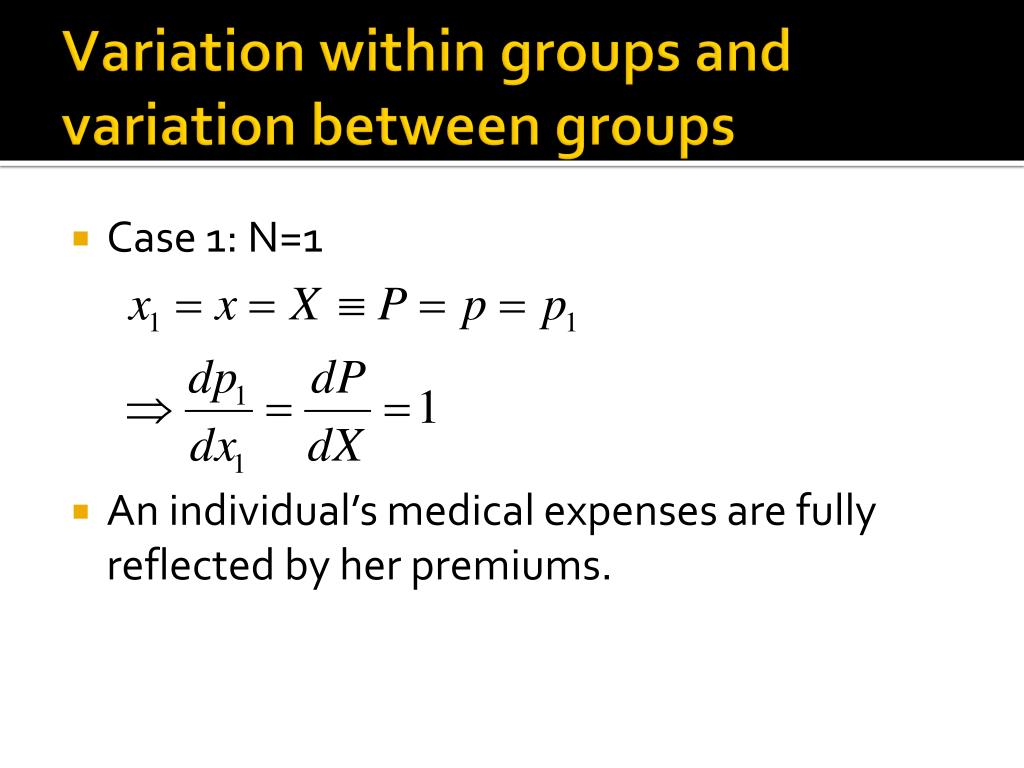 Variation within groups and variation between groups • Case 1: N=1 • An individual’s medical expenses are fully reflected by her premiums.
