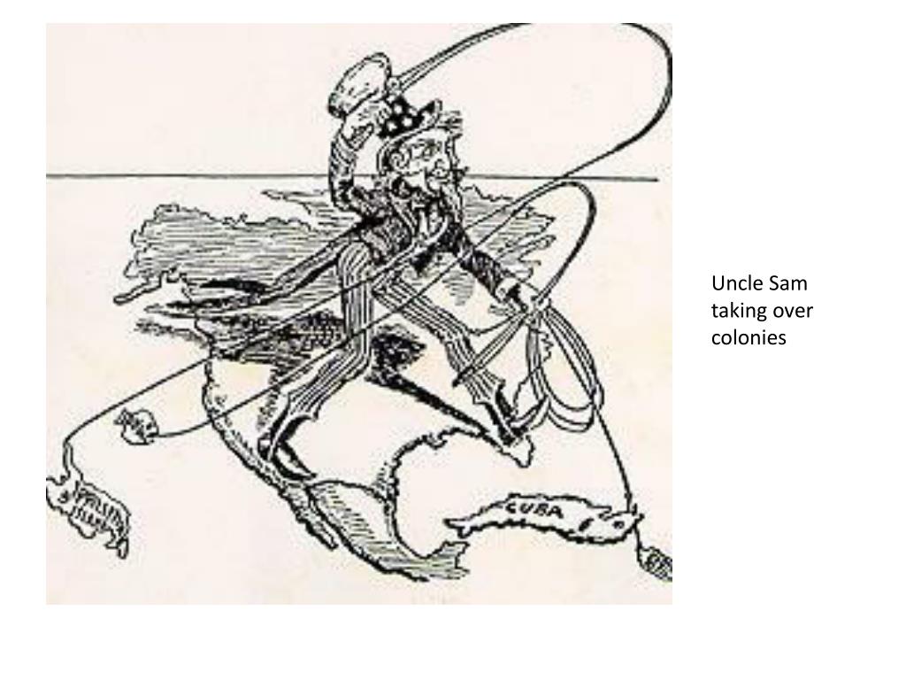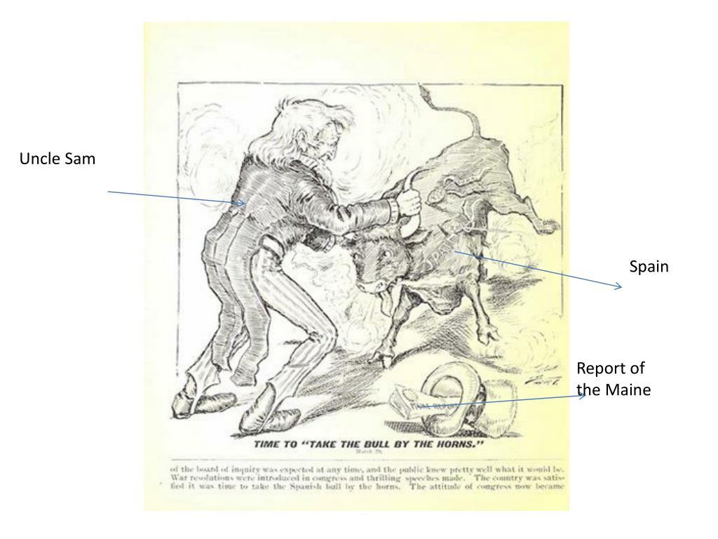 Political Cartoons. Spanish American War and American becomes a world power. Helps the reader. Title. Matador (Fighter in Spain). Signifies American ( the stripes). Title. Uncle Sam. Spain. Report of the Maine. Uncle Sam taking over colonies. Your Turn.