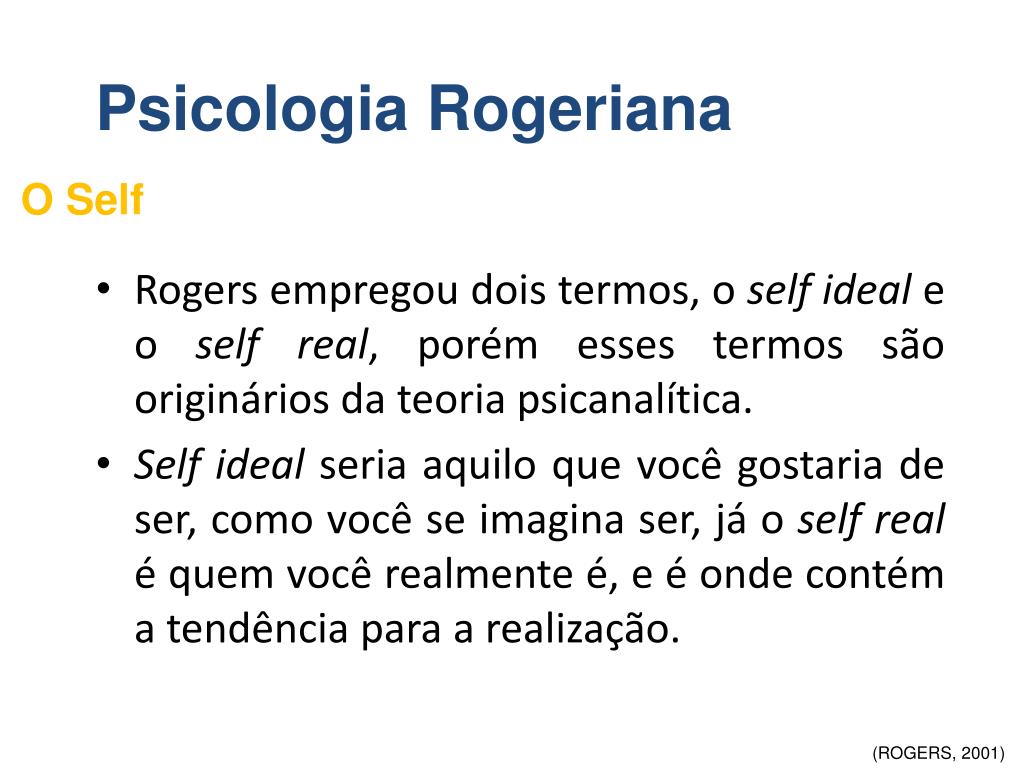 Psicologia Rogeriana O Self • Rogers empregou dois termos, o self ideal e o self real, porém esses termos são originários da teoria psicanalítica. • Self ideal seria aquilo que você gostaria de ser, como você se imagina ser, já o self real é quem você realmente é, e é onde contém a tendência para a realização. (ROGERS, 2001)