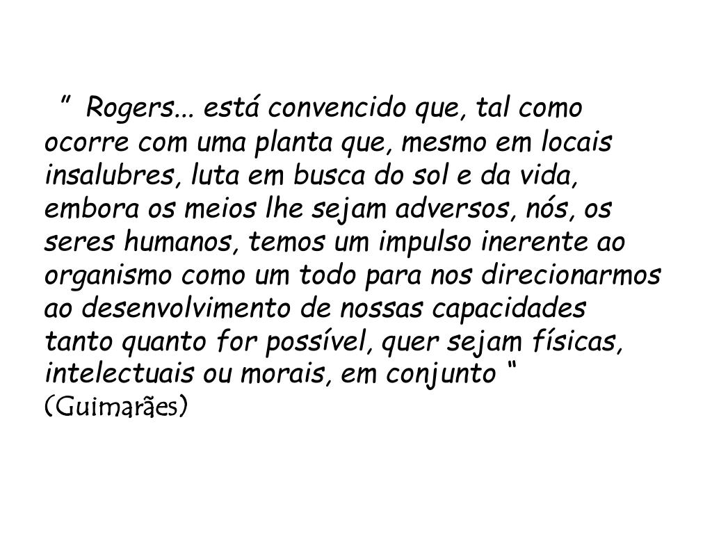 ” Rogers... está convencido que, tal como ocorre com uma planta que, mesmo em locais insalubres, luta em busca do sol e da vida, embora os meios lhe sejam adversos, nós, os seres humanos, temos um impulso inerente ao organismo como um todo para nos direcionarmos ao desenvolvimento de nossas capacidades tanto quanto for possível, quer sejam físicas, intelectuais ou morais, em conjunto “(Guimarães)