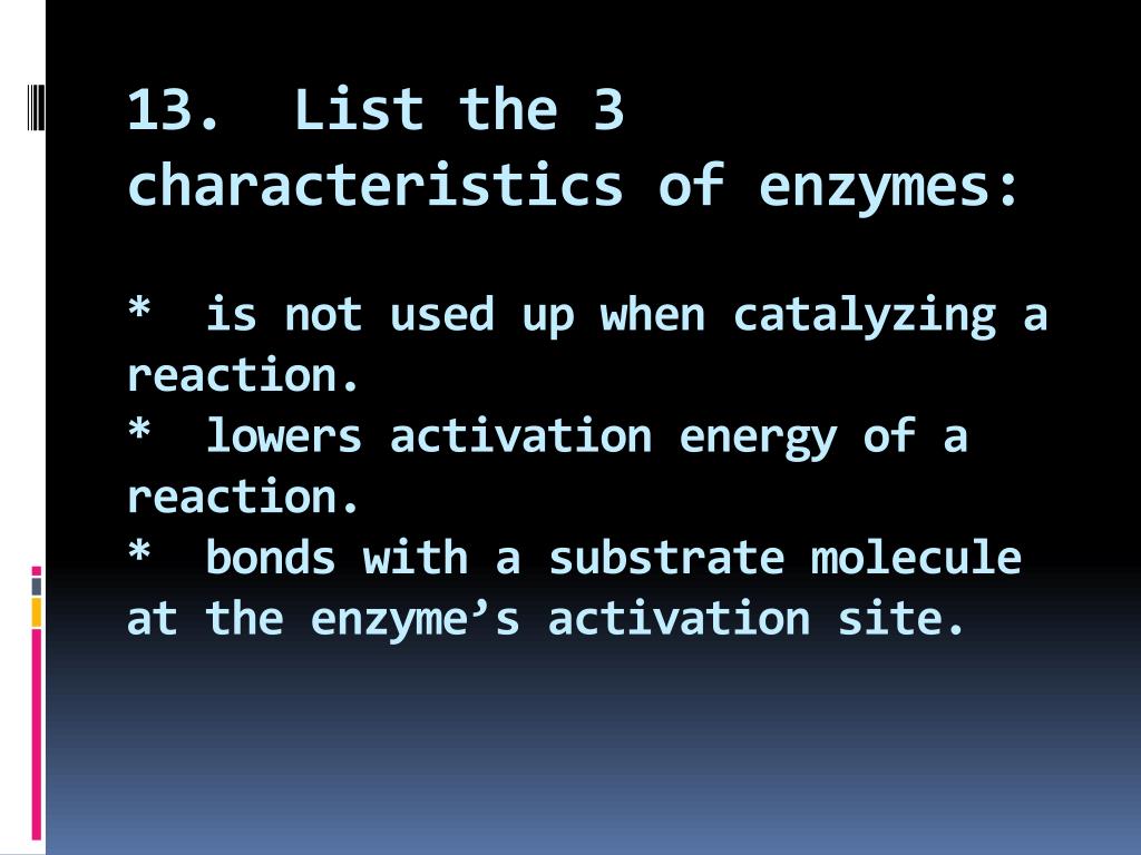 13. List the 3 characteristics of enzymes:* is not used up when catalyzing a reaction.* lowers activation energy of a reaction.* bonds with a substrate molecule at the enzyme’s activation site.