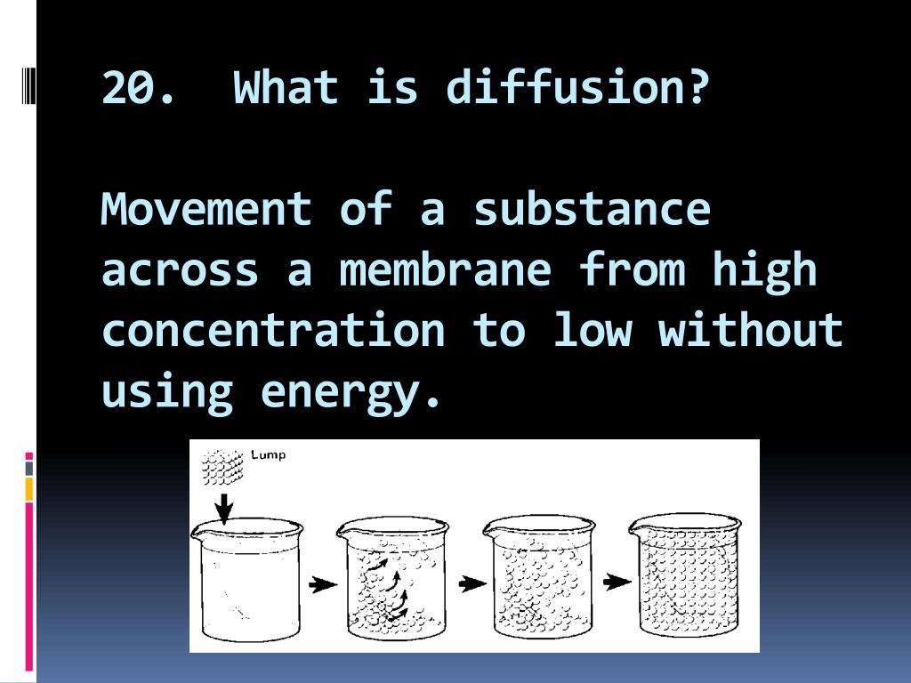 20. What is diffusion?Movement of a substance across a membrane from high concentration to low without using energy.