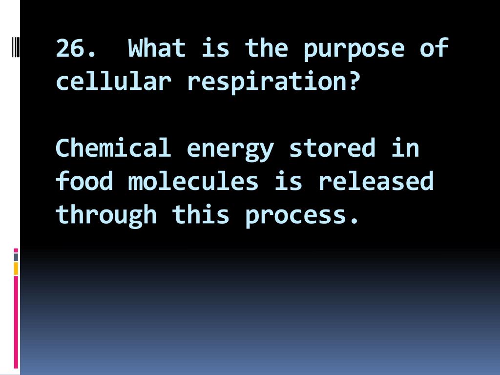 26. What is the purpose of cellular respiration?Chemical energy stored in food molecules is released through this process.