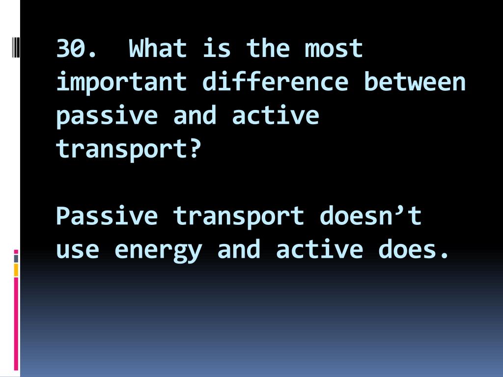 30. What is the most important difference between passive and active transport?Passive transport doesn’t use energy and active does.