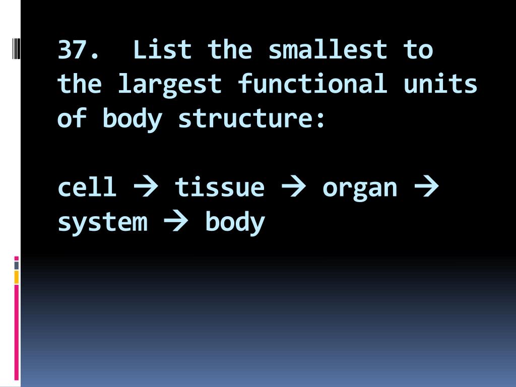 37. List the smallest to the largest functional units of body structure:cell tissue organ system body