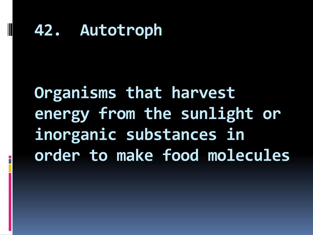 42. AutotrophOrganisms that harvest energy from the sunlight or inorganic substances in order to make food molecules