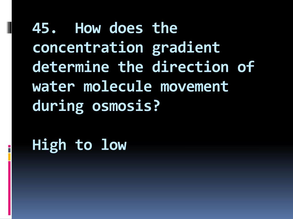 45. How does the concentration gradient determine the direction of water molecule movement during osmosis?High to low
