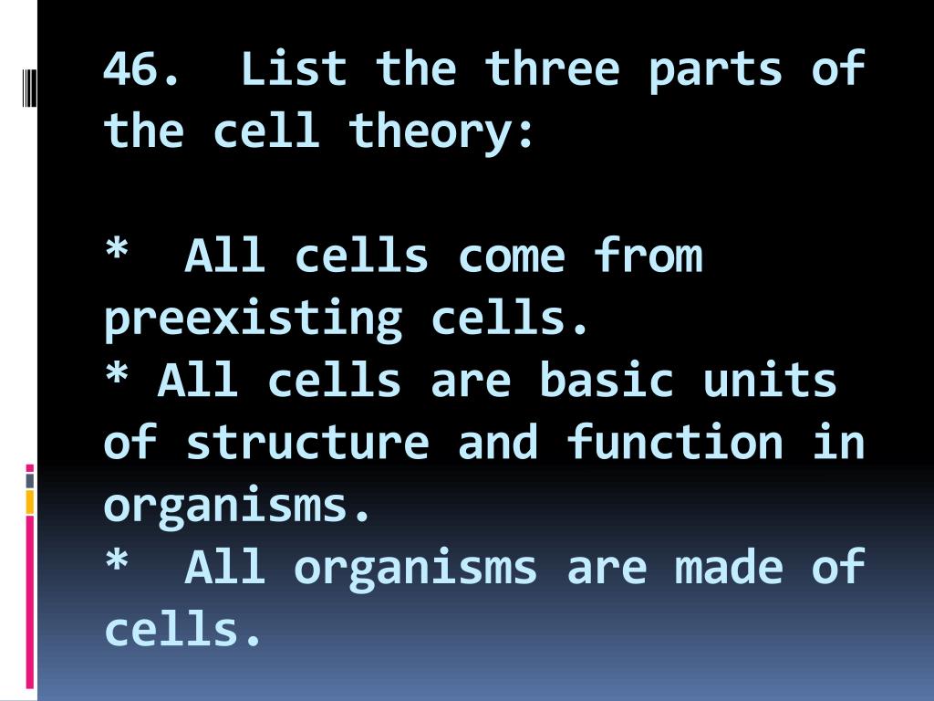 46. List the three parts of the cell theory:* All cells come from preexisting cells.* All cells are basic units of structure and function in organisms.* All organisms are made of cells.