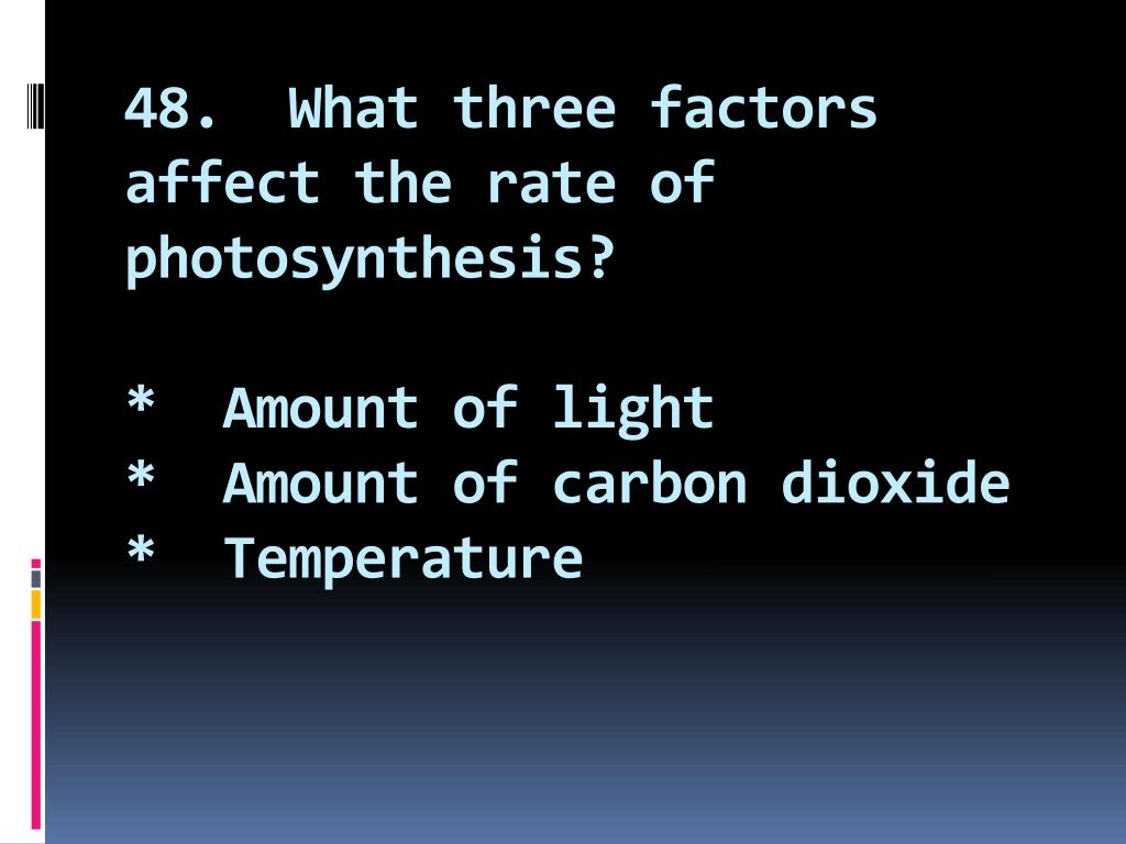 48. What three factors affect the rate of photosynthesis?* Amount of light* Amount of carbon dioxide* Temperature