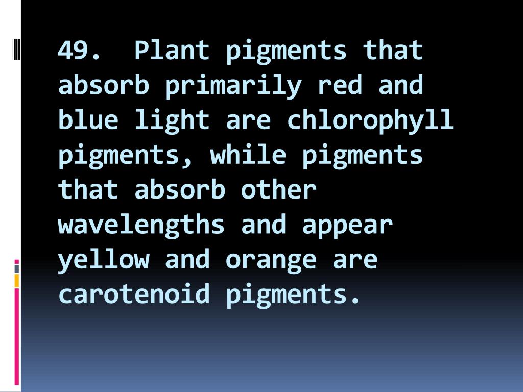 49. Plant pigments that absorb primarily red and blue light are chlorophyll pigments, while pigments that absorb other wavelengths and appear yellow and orange are carotenoid pigments.