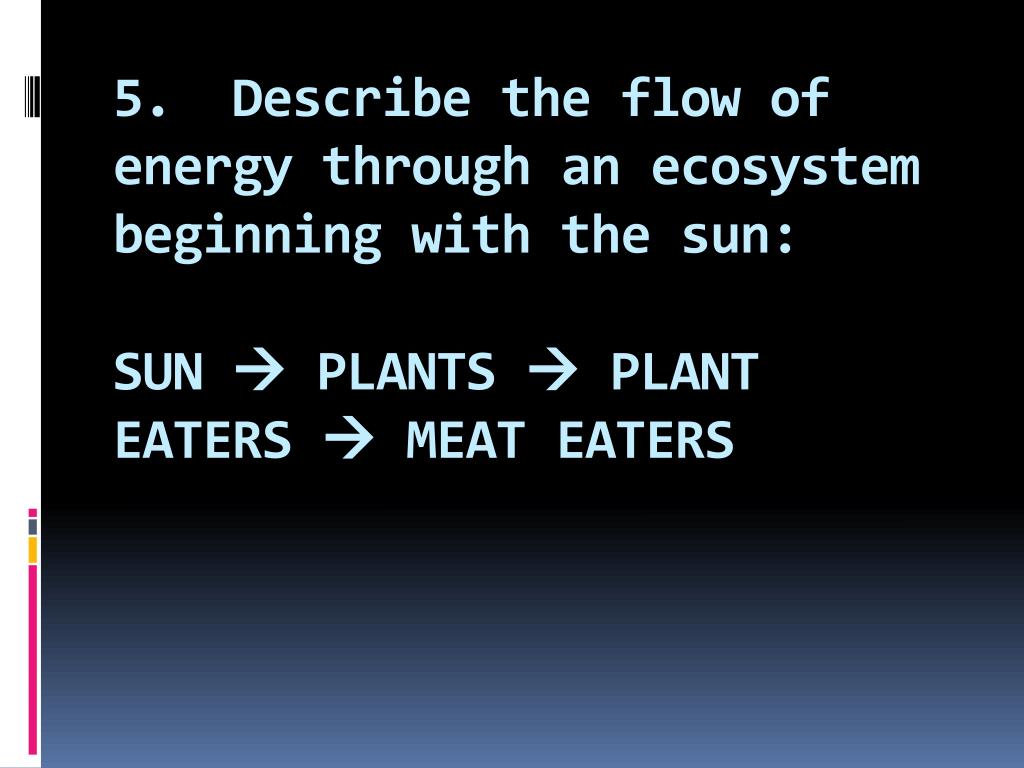 5. Describe the flow of energy through an ecosystem beginning with the sun:SUN PLANTS PLANT EATERS MEAT EATERS