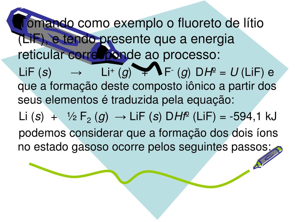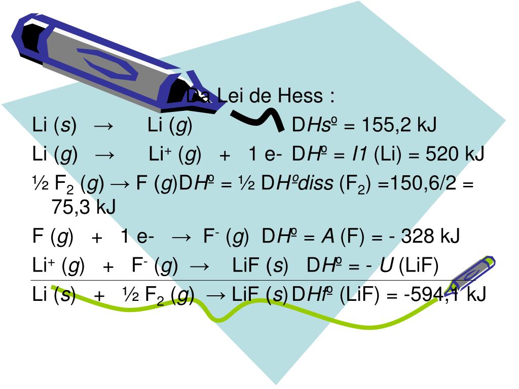 Este ciclo pode representar-se graficamente da seguinte forma: F- (g) Li+ (g) + I1(Li) = 520 kJ A(F) = - 328 kJ - U (LiF) F (g) Li (g) DHsº = 155,2 kJ ½ EL (F2) = 75,3 kJ Li (s) ½ F2 (g) LiF (s) + DHfº (LiF) = -594,1 kJ