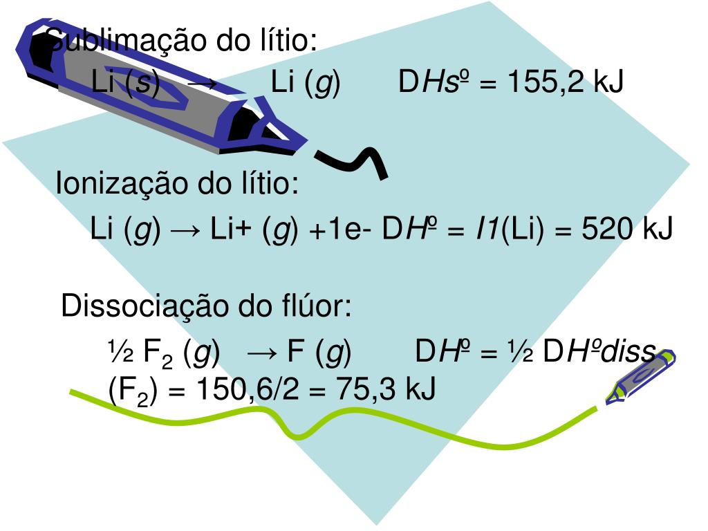 Sublimação do lítio: Li (s) → Li (g) DHsº = 155,2 kJ Ionização do lítio: Li (g) → Li+ (g) +1e- DHº = I1(Li) = 520 kJ Dissociação do flúor: ½ F2 (g) → F (g) DHº = ½ DHºdiss(F2) = 150,6/2 = 75,3 kJ